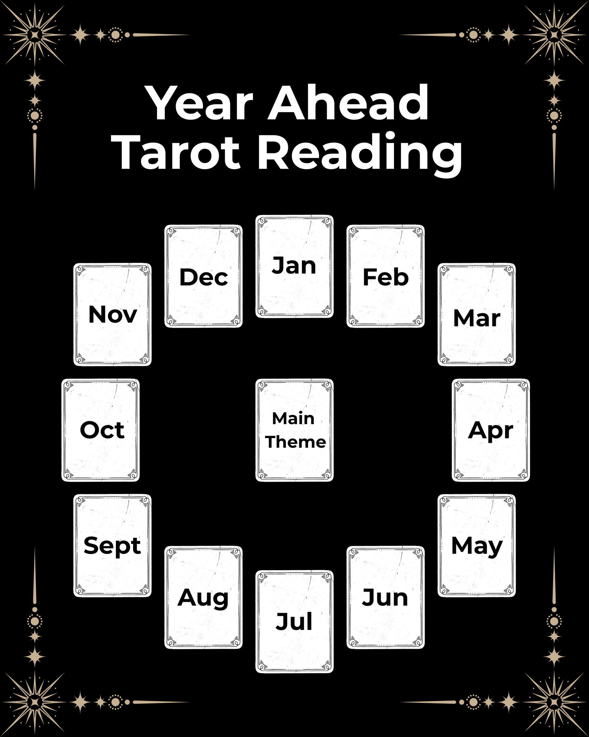 Gain insight into your upcoming year with a detailed 13-card tarot reading. Each card represents a month, offering guidance, challenges, and opportunities to prepare you for what’s ahead. The final, 13th card reveals the main spiritual lesson or overarching theme that will guide your year — your personal focus for growth and transformation.